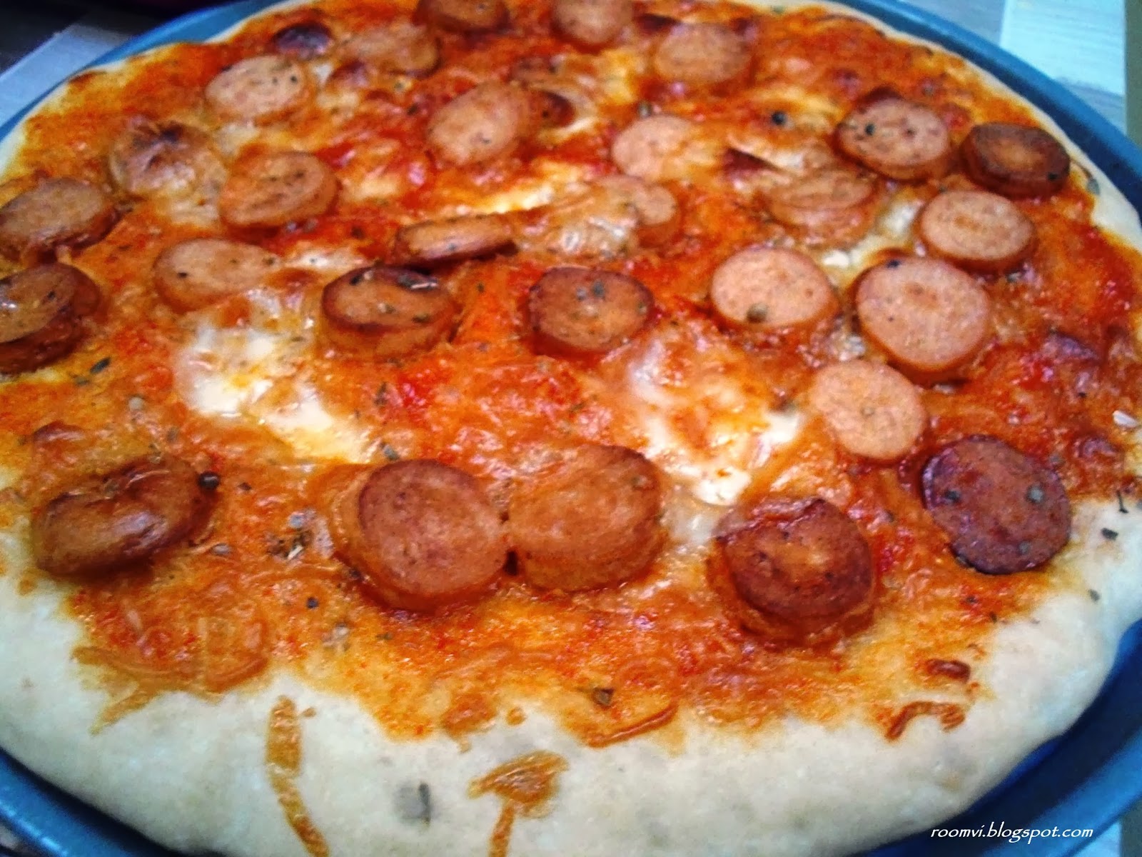 untuk toppingnya suka-suka aja, kalau saya ini memanfaatkan yang ada di kulkas pakai saus sambal, taburi dengan mozzarela parut, tata sosis dan bawang bombay yang sudah di goreng sebentar dengan sedikit margarin, taburi sedikit origano dan mozzarela potong.